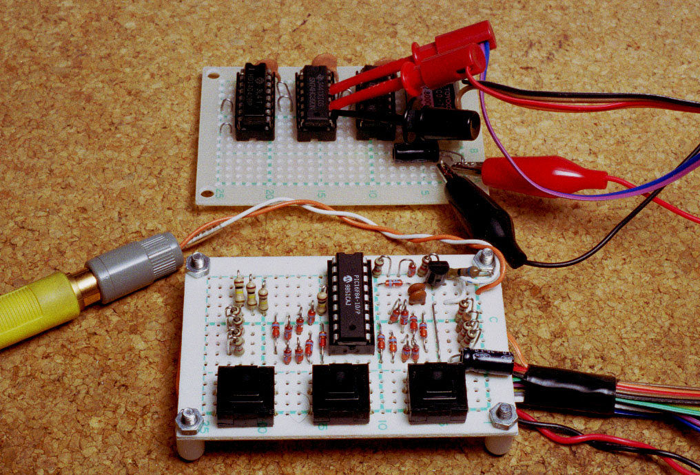 PIC Logic Scope Adapter は、PIC16F84 を使った、8ch のロジックスコープを 実現するアダプタです。出力はコンポジットビデオ信号ですので、ビデオ入力を もつテレビや、液晶モニタに表示することができます。 サンプリング周期は表示しながらの場合には、16kHz から 1Hz (16kHz, 8kHz, 4kHz, 2kHz, 1kHz, 200Hz, 100Hz, 20Hz, 10Hz, 2Hz, 1Hz) 、 表示を中断する場合には、PIC16F84のオッシレータ周波数の 1/12 (3命令で実現) となっています。一画面あたりの表示サンプル数は 8ch x 50 です。